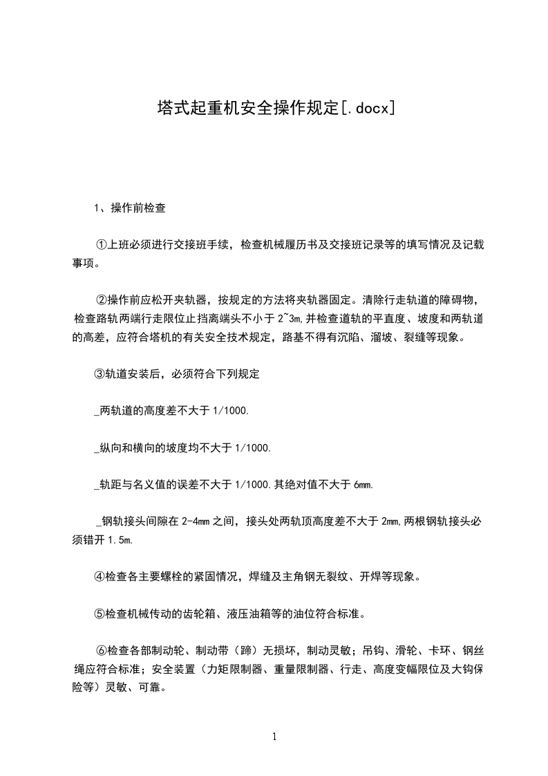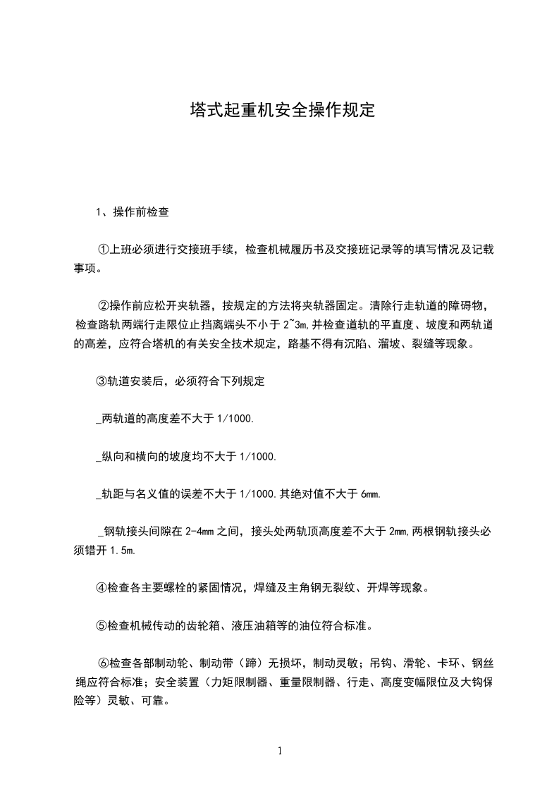 ②操作前应松开夹轨器,按规定的方法将夹轨器固定。清除行走轨道的障碍物,检查路轨两端行走限位止挡离端头不小于2~3m,并检查道轨的平直度、坡度和两轨道的高差,应符合塔机的有关安全技术规定,路基不得有沉陷、溜坡、裂缝等现象。