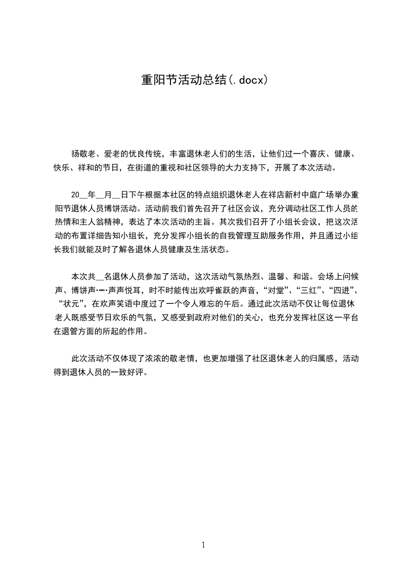 20__年__月__日下午根据本社区的特点组织退休老人在祥店新村中庭广场举办重阳节退休人员博饼活动。活动前我们首先召开了社区会议,充分调动社区工作人员的热情和主人翁精神,表达了本次活动的主旨。其次我们召开了小组长会议,把这次活动的布置详细告知小组长,充分发挥小组长的自我管理互助服务作用,并且通过小组长我们就能及时了解各退休人员健康及生活状态。