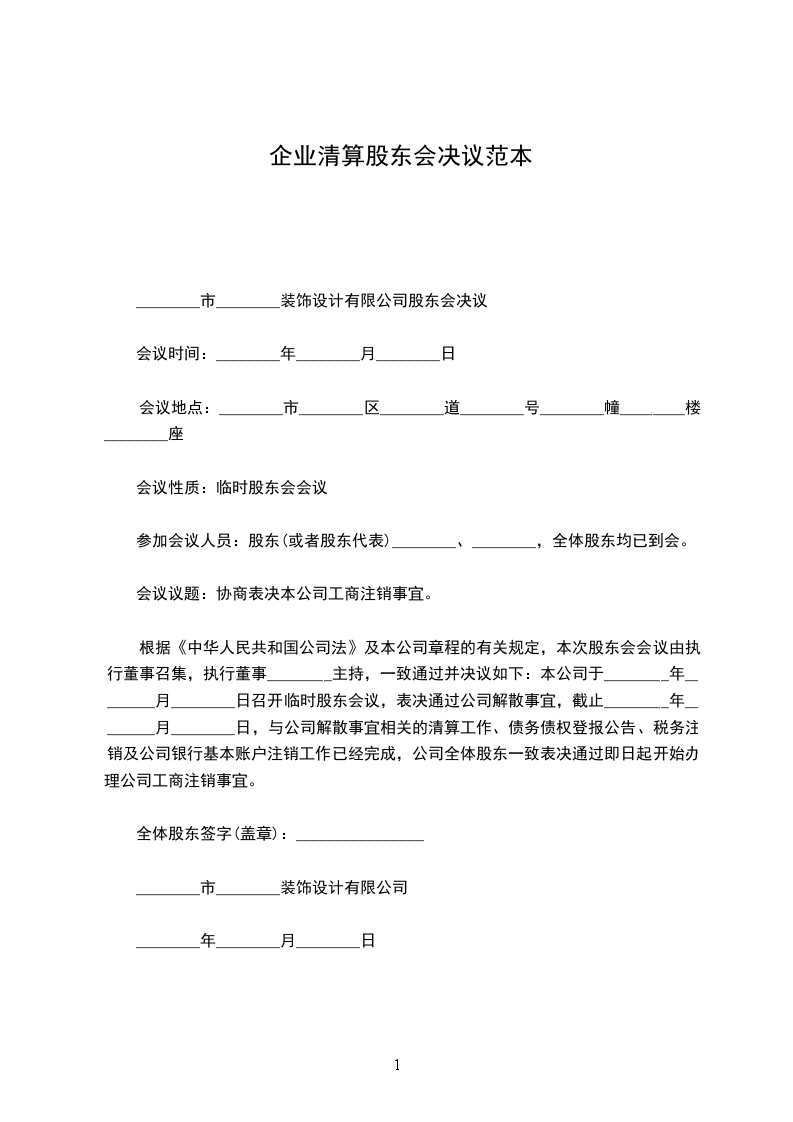 根据《中华人民共和国公司法》及本公司章程的有关规定,本次股东会会议由执行董事召集,执行董事________主持,一致通过并决议如下:本公司于________年________月________日召开临时股东会议,表决通过公司解散事宜,截止________年________月________日,与公司解散事宜相关的清算工作、债务债权登报公告、税务注销及公司银行基本账户注销工作已经完成,公司全体股东一致表决通过即日起开始办理公司工商注销事宜。