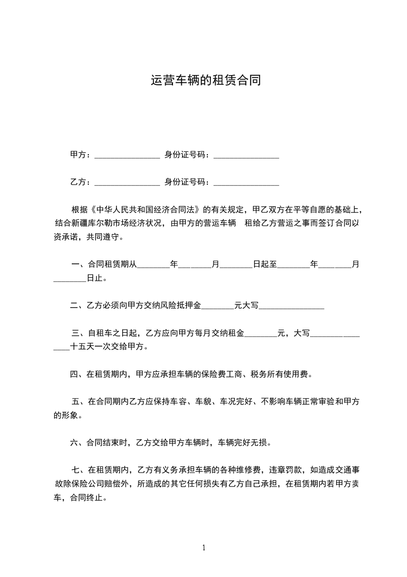 根据《中华人民共和国民法典》的有关规定,甲乙双方在平等自愿的基础上,结合新疆库尔勒市场经济状况,由甲方的营运车辆 租给乙方营运之事而签订合同以资承诺,共同遵守。