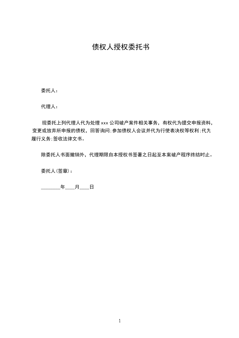 现委托上列代理人代为处理xxx公司破产案件相关事务,有权代为提交申报资料,变更或放弃所申报的债权,回答询问;参加债权人会议并代为行使表决权等权利;代为履行义务;签收法律文书。