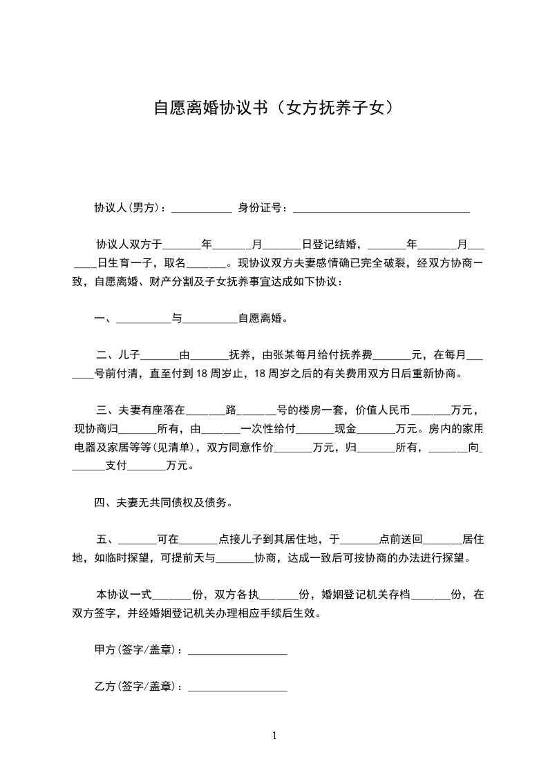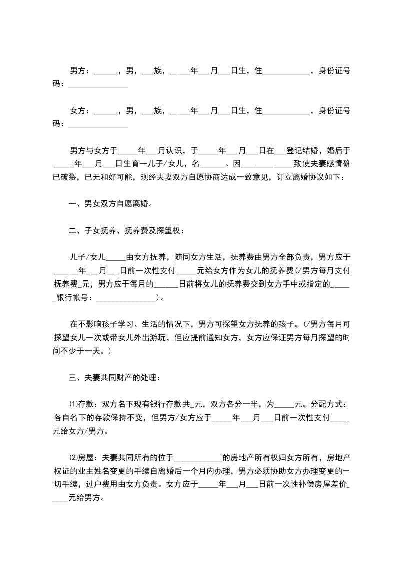 1、甲方同意座落于____________________房屋一套归乙方所有,以及甲乙双方婚姻存续期间的其它全部财产归乙方所有。