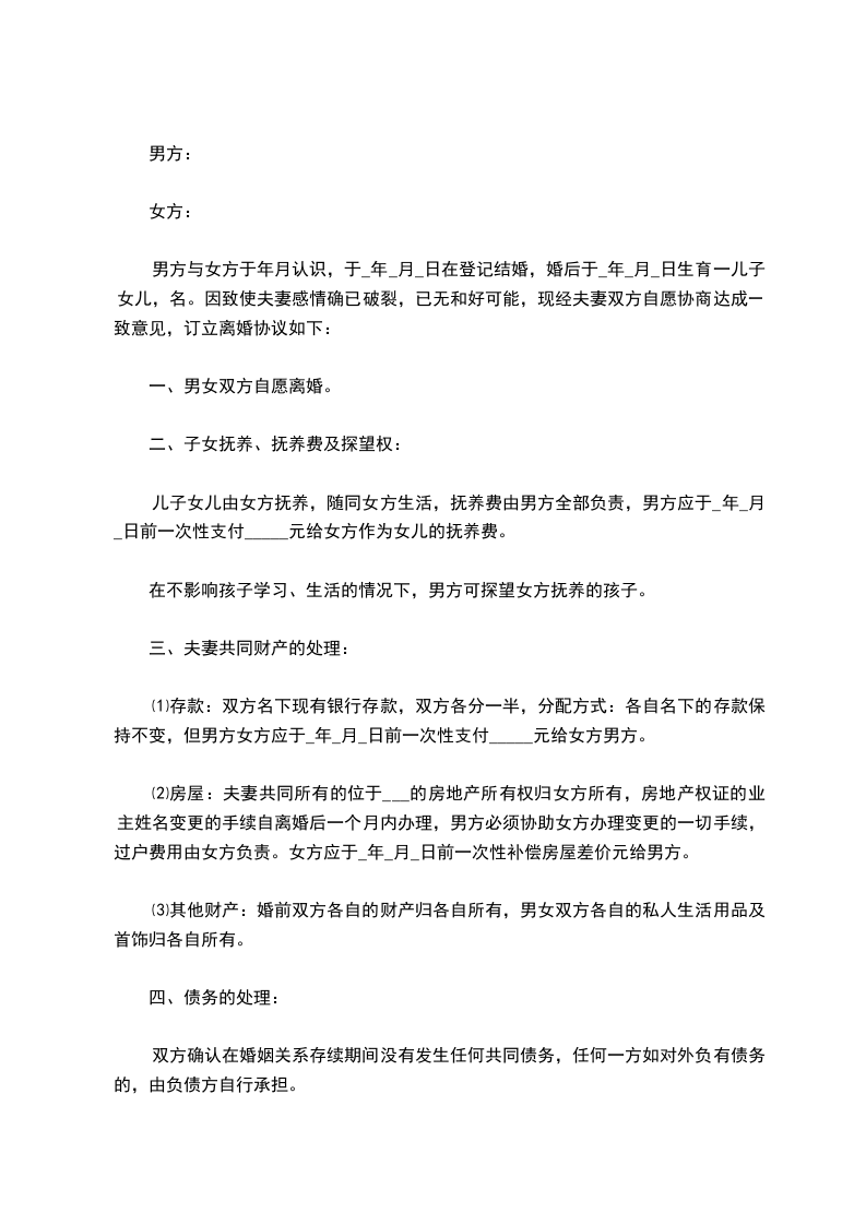 1、甲方双方确认现有夫妻共同债务__________元,该债务由__________承担。