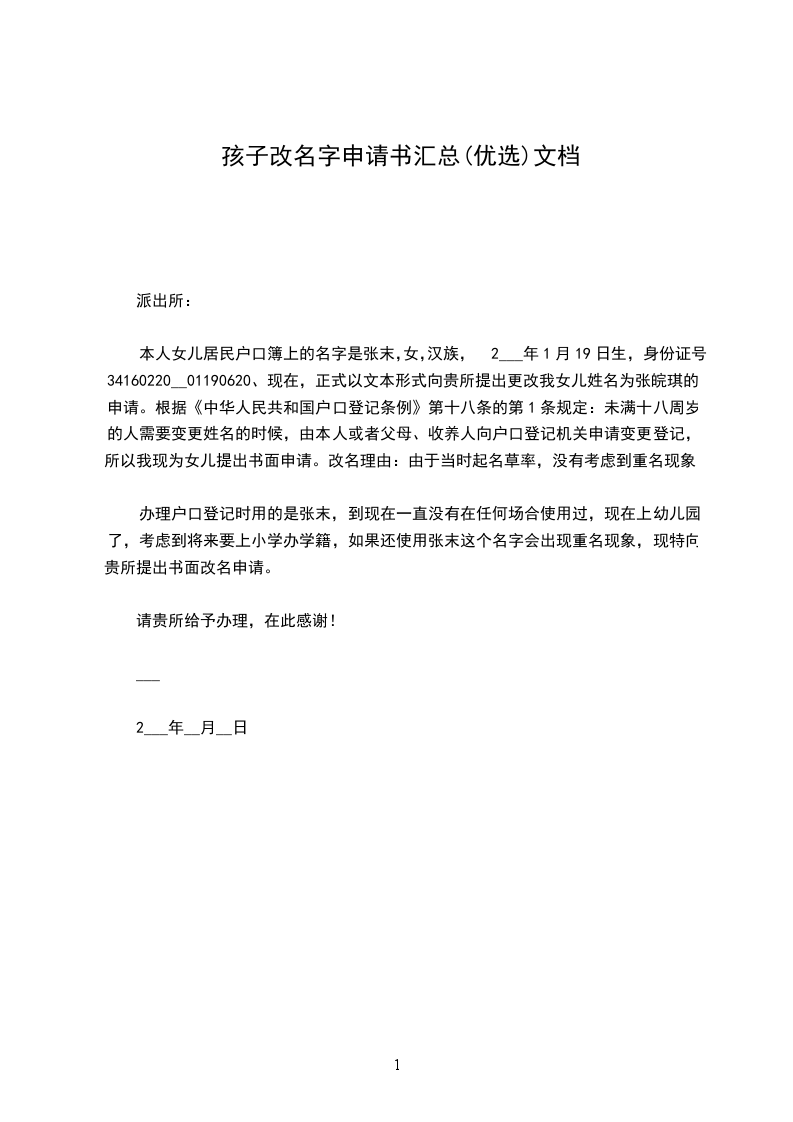 光明里派出所:本人现居住于,女儿居民户口簿上的名字是__,女,汉族,_____生,身份证号:____________现在,正式以文本形式向贵所提出更改我女儿姓名为____的申请。根据《中华人民共和国户口登记条例》第十八条的第1条规定:未满十八周岁的人需要变更姓名的时候,由本人或者父母、收养人向户口登记机关申请变更登记,所以我现为女儿提出书面申请。改名理由:由于当时起名草率,重名率太高,为方便以后的升学和就业,现特提出书面改名申请。我知道,这样会给贵所带来额外的工作,但还是肯请贵所予以批准我为女儿的改名申请为谢!特此申请