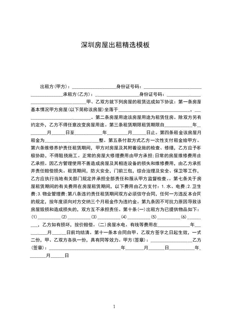 一、甲方将座落在深圳市房产建筑面积计____平方尺,租给乙方作使用,租期为____年,从_____年____月____日起至____年____月____日止。