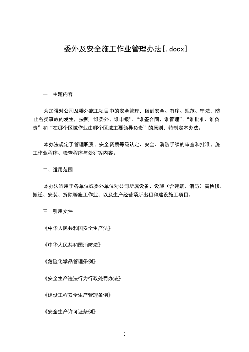 为贯彻“安全第一,预防为主,综合治理”的安全生产方针,依据《安全生产法》中关于外委工程安全管理的有关规定,为加强对外委工程、外委单位的安全环保管理,确保施工作业安全,制定本办法。