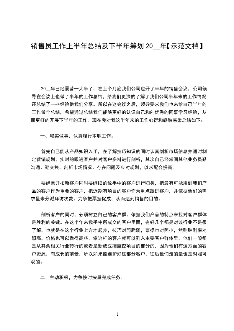 20__年已经曩昔一大半了,在上个月底我们公司也开了半年的销售会议,公司领导在会议上也做了半年的工作总结,给我们更深的了解了我们公司半年来的工作情况,还总结了一些经验供我们分享。所以在这会议之后,领导要求我们也来给自己半年的工作做个总结,希望通过总结我们能够更好的认识自己和向优秀的同事学习经验,从而更好的开展下半年的工作。现在我对我这半年来的工作心得和感触感染总结如下: