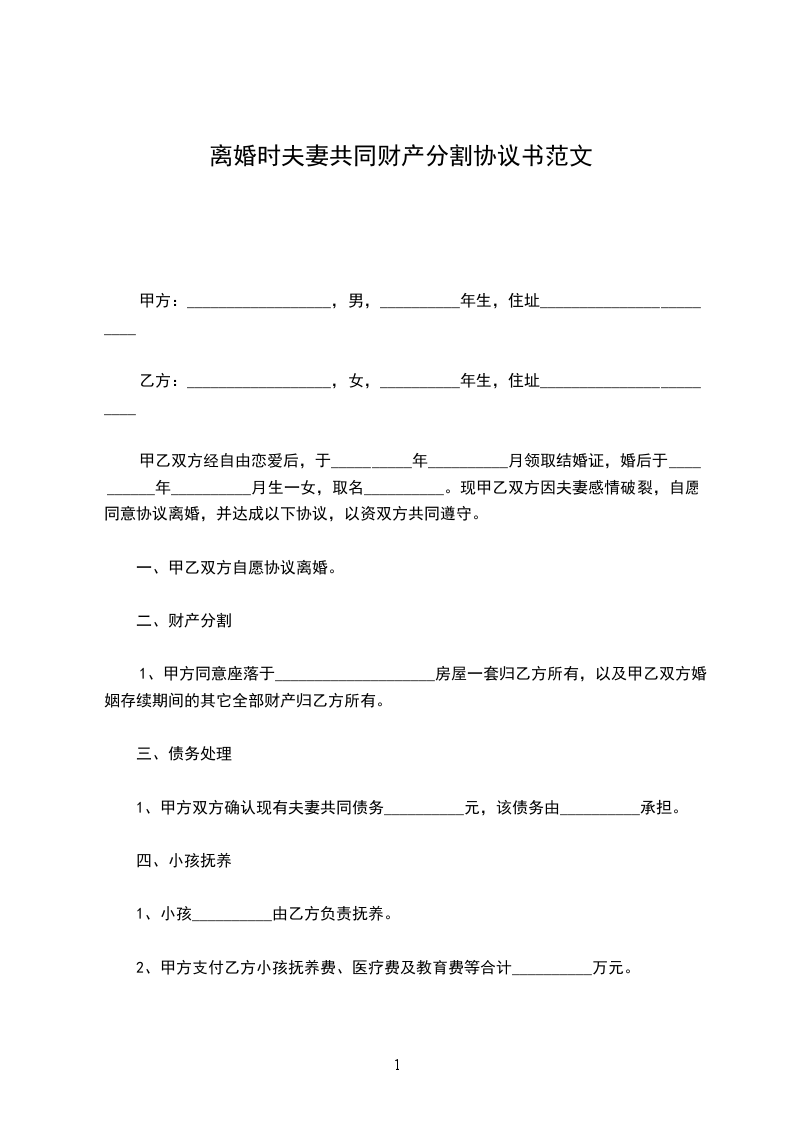 1、甲方同意座落于____________________房屋一套归乙方所有,以及甲乙双方婚姻存续期间的其它全部财产归乙方所有。