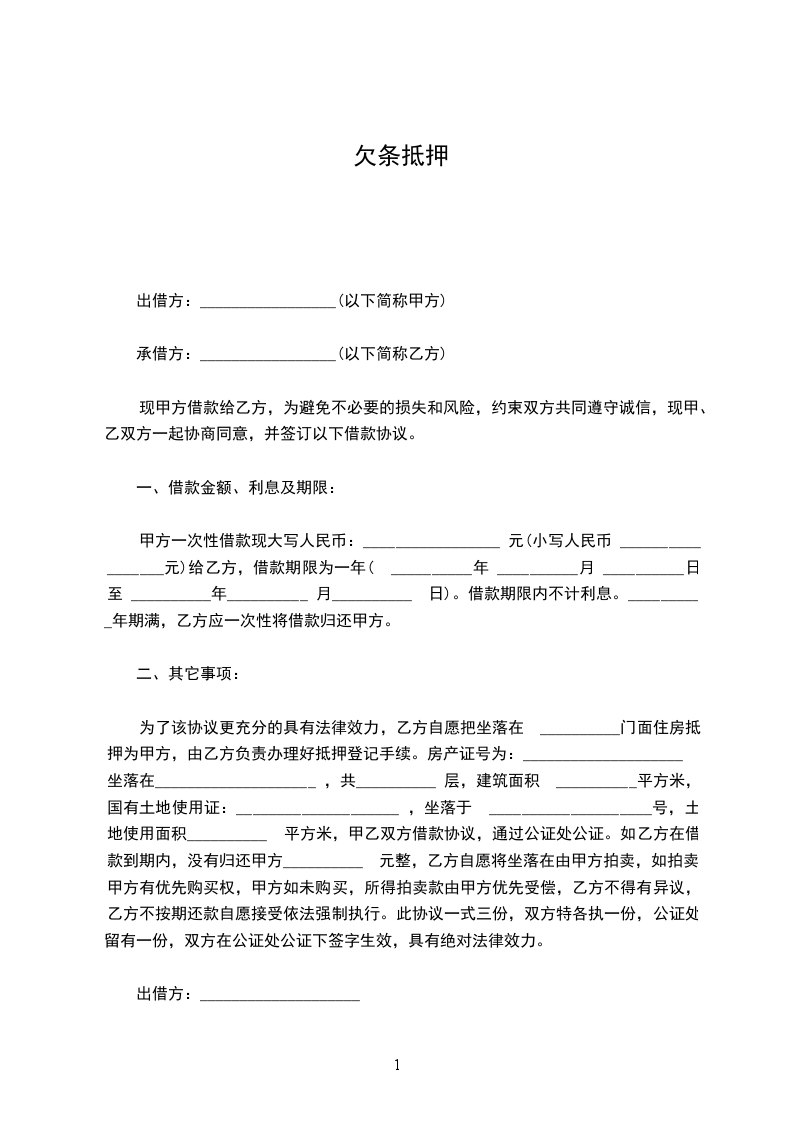 甲方一次性借款现大写人民币:_________________ 元(小写人民币 _________________元)给乙方,借款期限为一年( __________年 __________月 __________日至 __________年__________ 月__________ 日)。借款期限内不计利息。__________年期满,乙方应一次性将借款归还甲方。