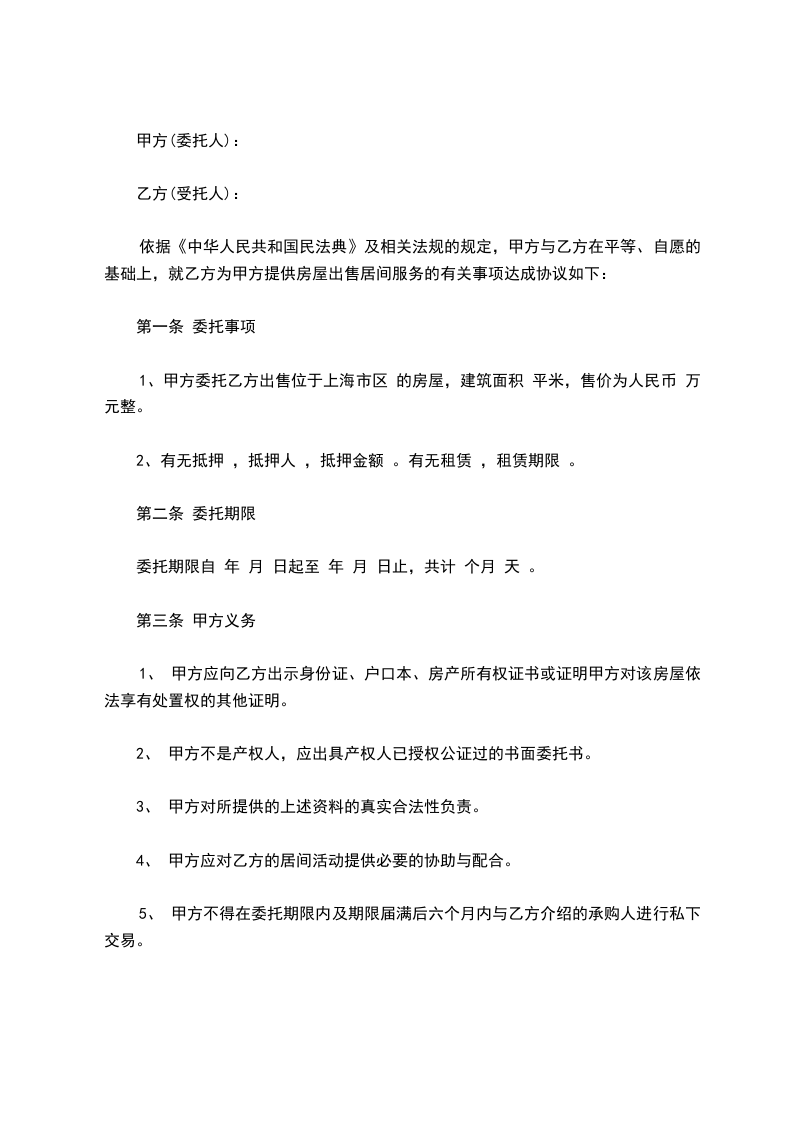 1、甲方委托乙方出售位于上海市区 的房屋,建筑面积 平米,售价为人民币 万元整。