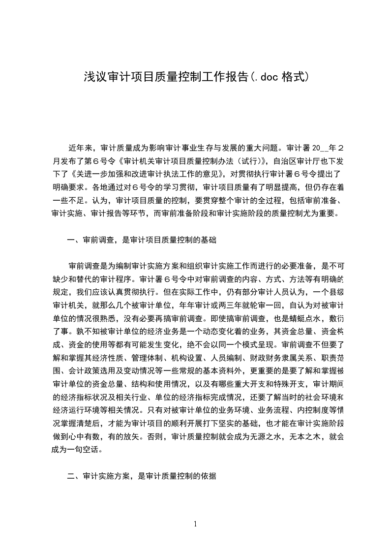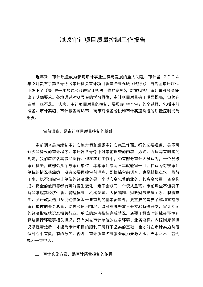 近年来,审计质量成为影响审计事业生存与发展的重大问题。审计署20__年2月发布了第6号令《审计机关审计项目质量控制办法(试行)》,自治区审计厅也下发下了《关进一步加强和改进审计执法工作的意见》,对贯彻执行审计署6号令提出了明确要求。各地通过对6号令的学习贯彻,审计项目质量有了明显提高,但仍存在着一些不足。认为,审计项目质量的控制,要贯穿整个审计的全过程,包括审前准备、审计实施、审计报告等环节,而审前准备阶段和审计实施阶段的质量控制尤为重要。