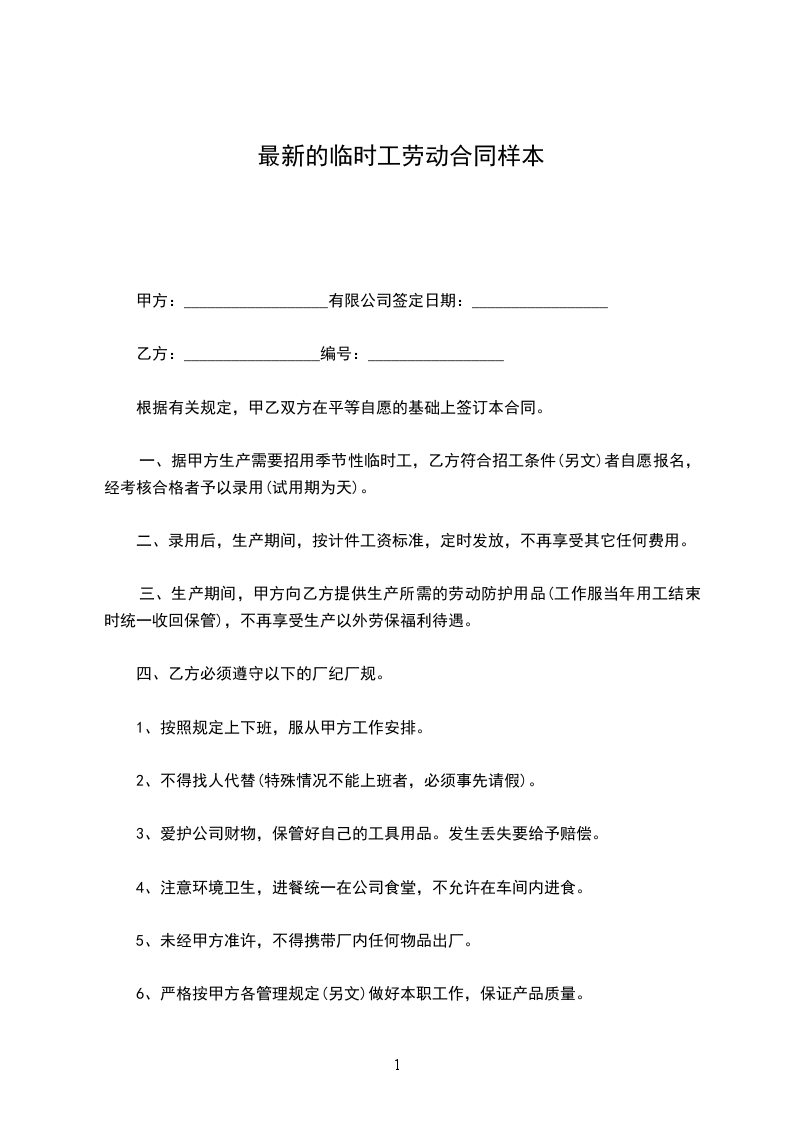 甲方聘用乙方在甲方(部门)担任临时岗位工作。合同期限为一年,自________年____月____日至________年____月____日。