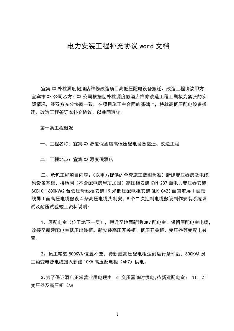 (1)原合同中的一期合同总价(人民币________万元)保证在项目通电前付清。具体付款时间及金额为______年______月______日付______万元,______年______月______日付________万元, ______年______月______日付40万元,______年______月______日付________万元。