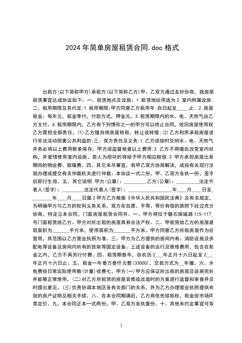 四、乙方同意预交____元作为保证金,合同终止时,当作房租冲抵。