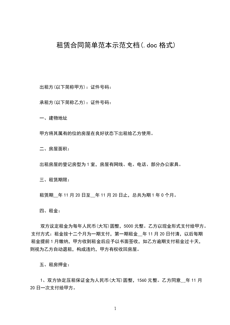 1、双方协定压租保证金为人民币(大写)圆整,1560元整。乙方同意__年11月20日一次支付给甲方。