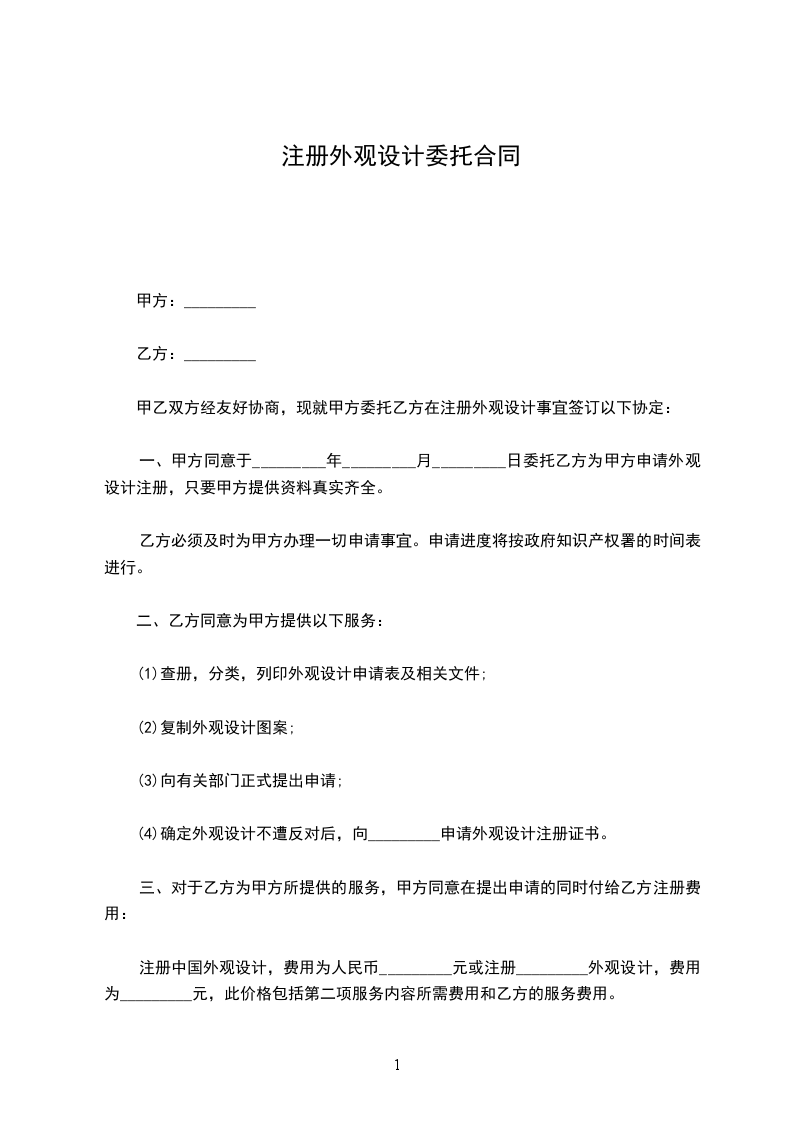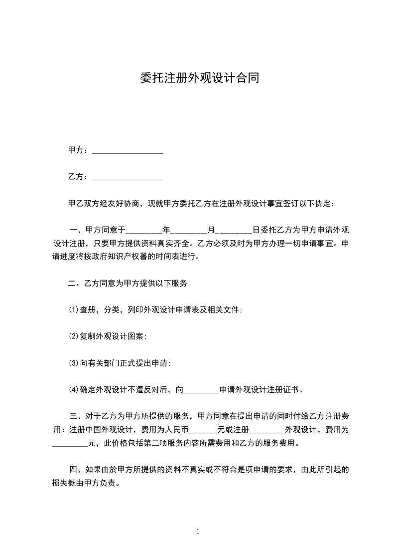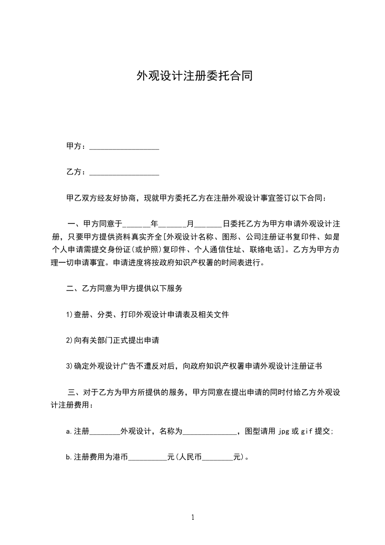 一、甲方同意于_______年_______月_______日委托乙方为甲方申请外观设计注册,只要甲方提供资料真实齐全[外观设计名称、图形、公司注册证书复印件、如是个人申请需提交身份证(或护照)复印件、个人通信住址、联络电话]。乙方为甲方办理一切申请事宜。申请进度将按政府知识产权署的时间表进行。