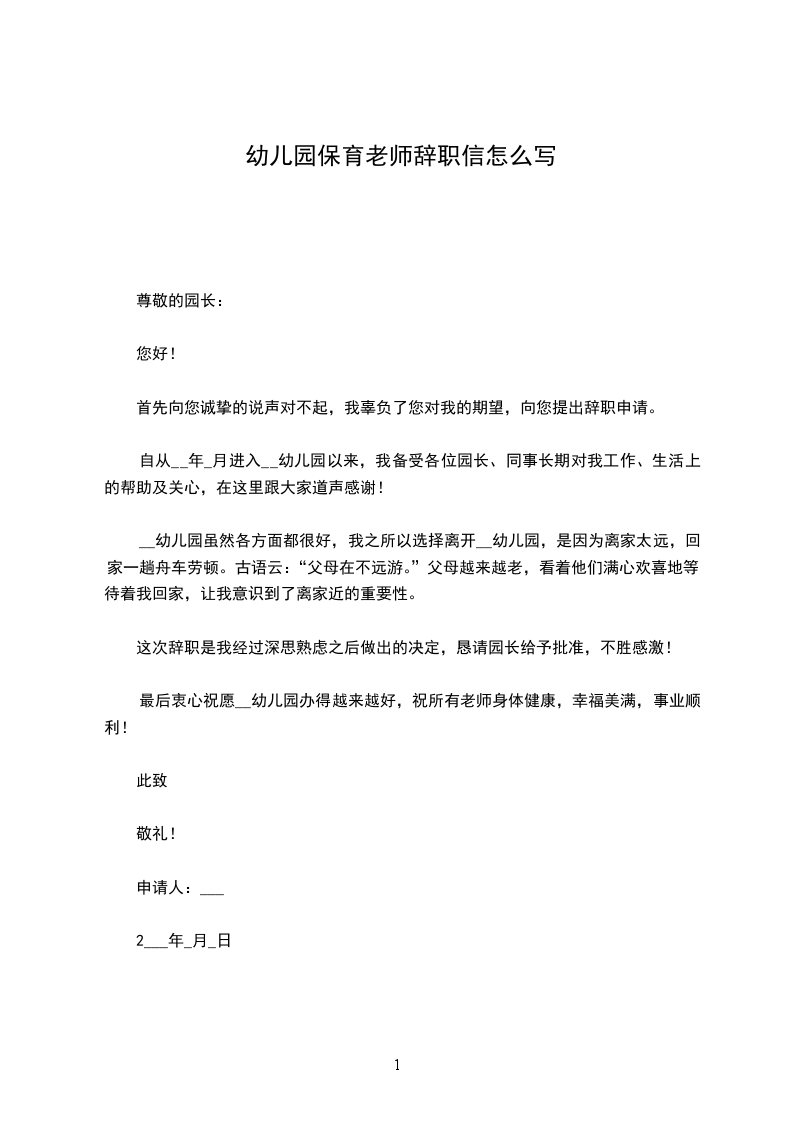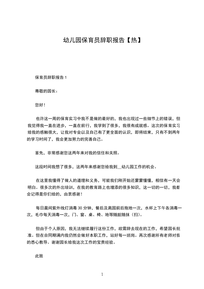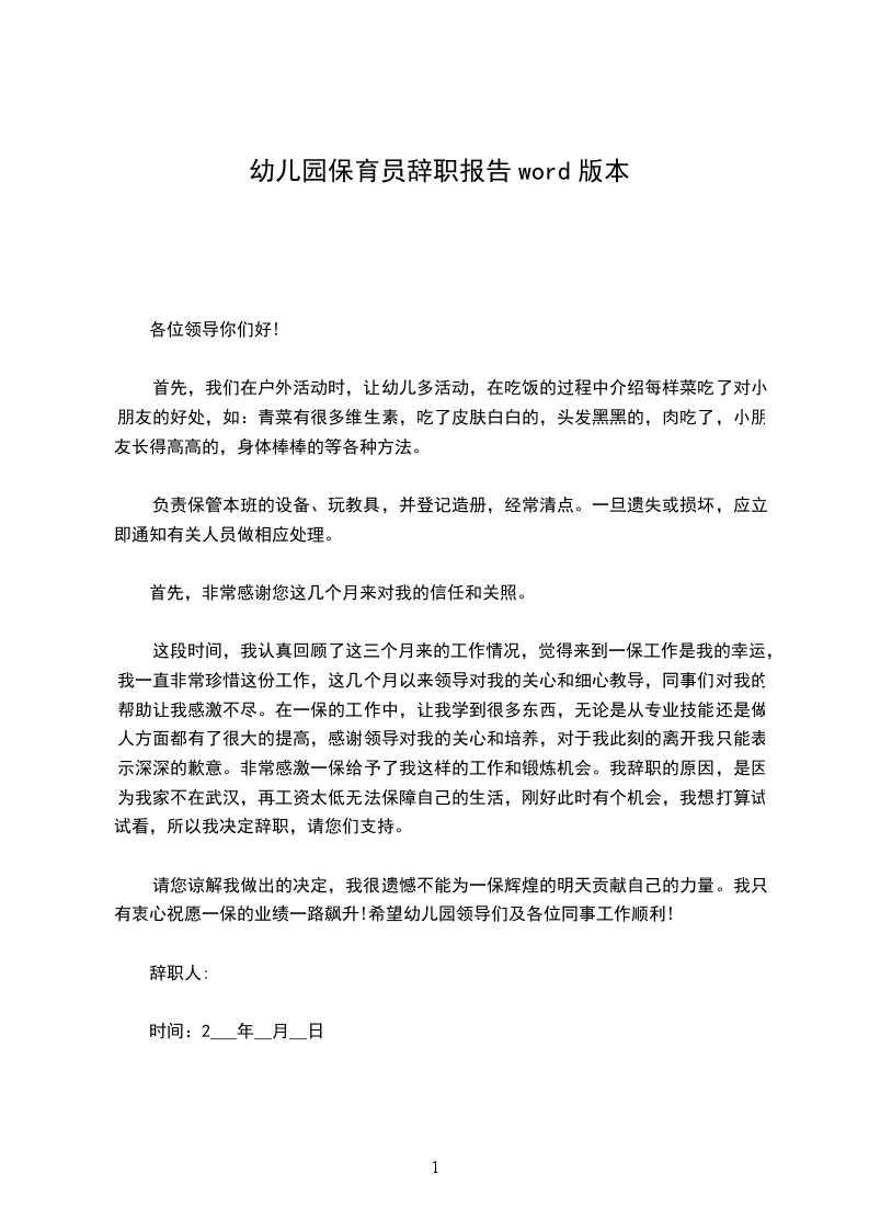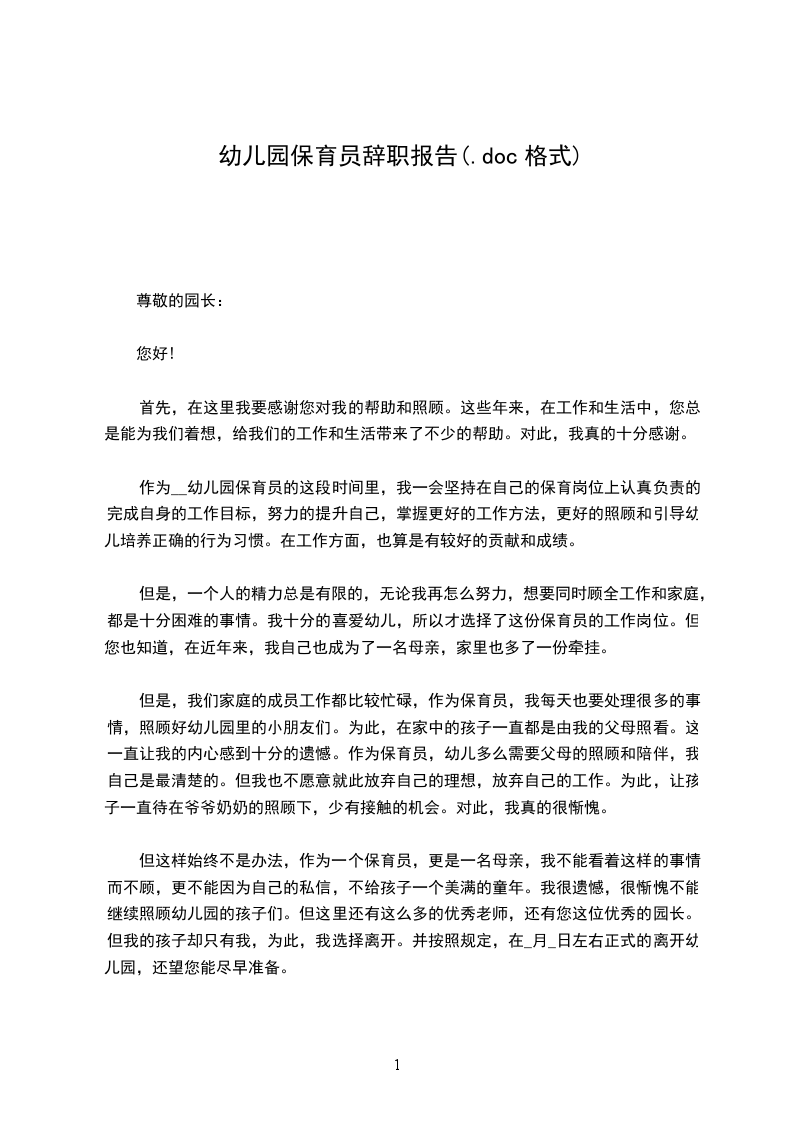 但这样始终不是办法,作为一个保育员,更是一名母亲,我不能看着这样的事情而不顾,更不能因为自己的私信,不给孩子一个美满的童年。我很遗憾,很惭愧不能继续照顾幼儿园的孩子们。但这里还有这么多的优秀老师,还有您这位优秀的园长。但我的孩子却只有我,为此,我选择离开。并按照规定,在_月_日左右正式的离开幼儿园,还望您能尽早准备。