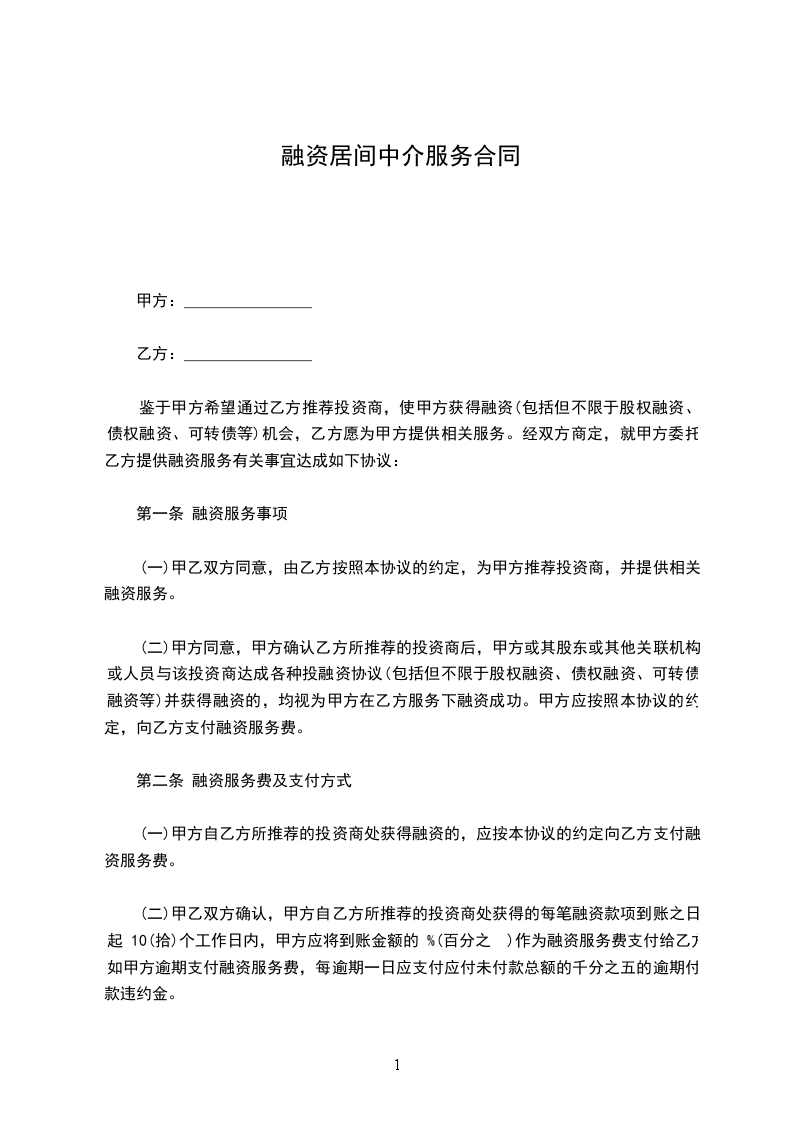 鉴于甲方希望通过乙方推荐投资商,使甲方获得融资(包括但不限于股权融资、债权融资、可转债等)机会,乙方愿为甲方提供相关服务。经双方商定,就甲方委托乙方提供融资服务有关事宜达成如下协议: