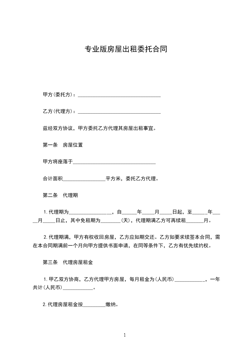 1.甲乙双方协商,乙方代理甲方房屋,每月租金为(人民币)____________,一年共计(人民币)____________.