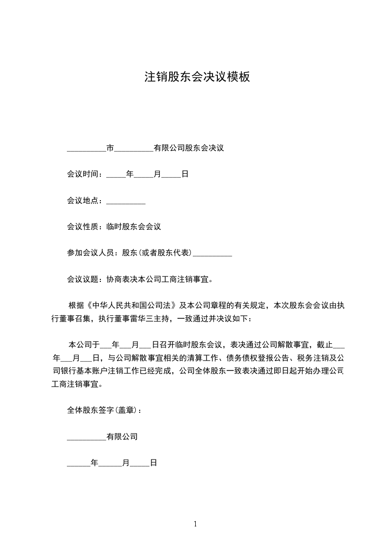 本公司于___年___月___日召开临时股东会议,表决通过公司解散事宜,截止___年___月___日,与公司解散事宜相关的清算工作、债务债权登报公告、税务注销及公司银行基本账户注销工作已经完成,公司全体股东一致表决通过即日起开始办理公司工商注销事宜。