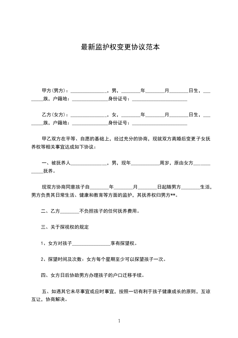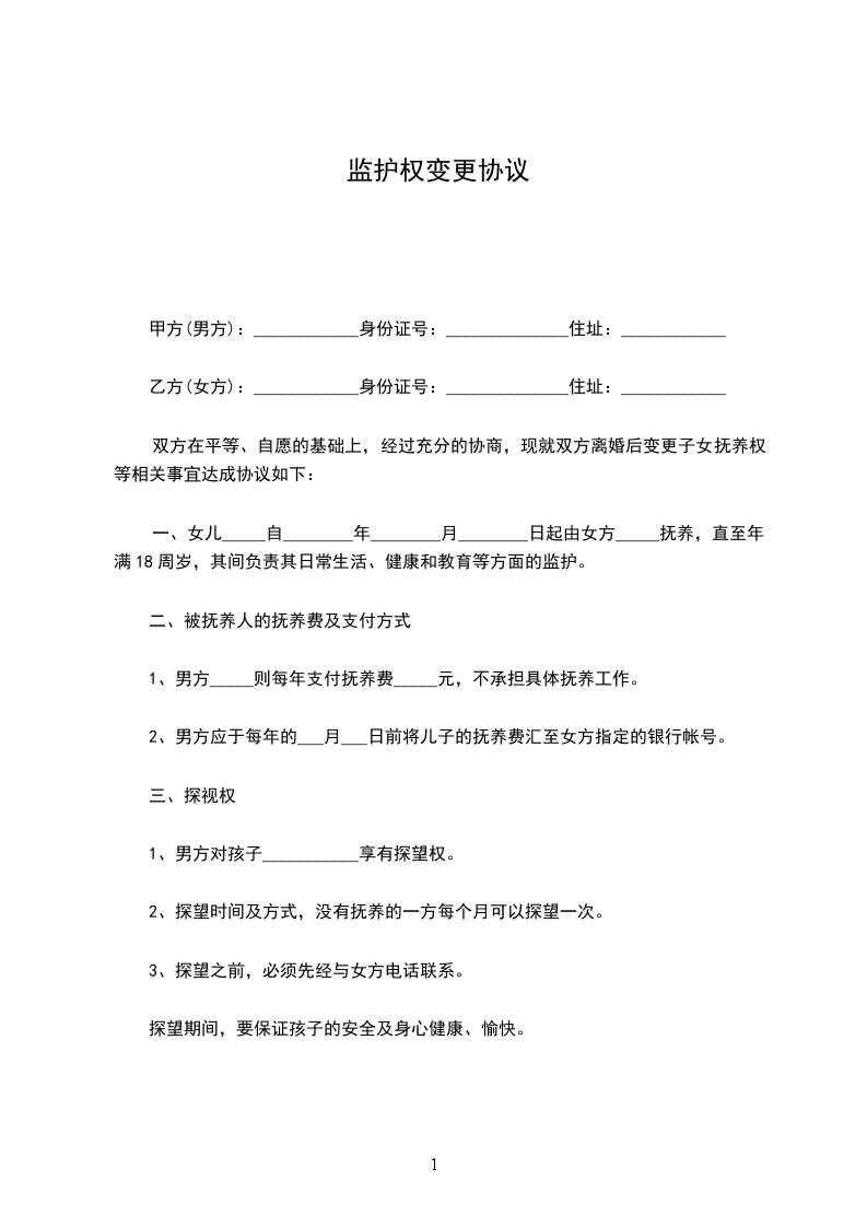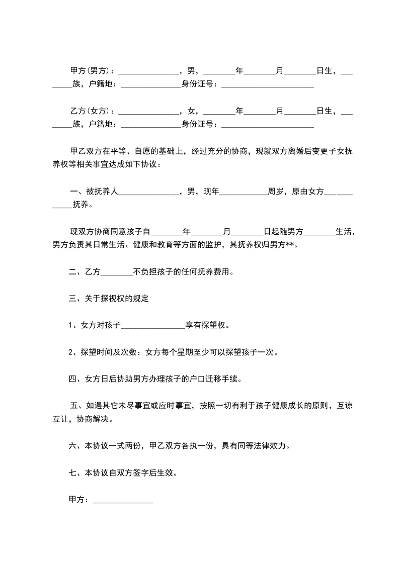 双方在平等、自愿的基础上,经过充分的协商,现就双方离婚后变更子女抚养权等相关事宜达成协议如下: