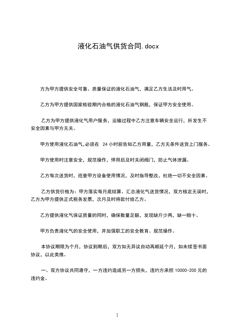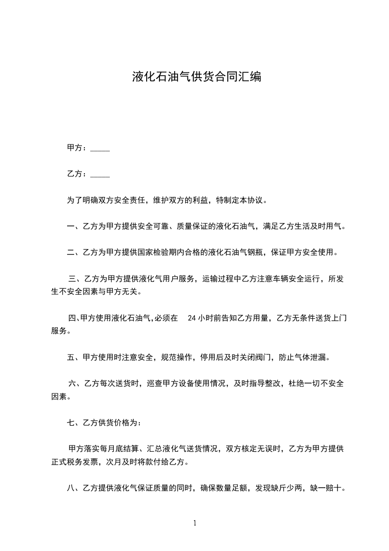 一、乙方为甲方提供安全可靠、质量保证的液化石油气,满足乙方生活及时用气。