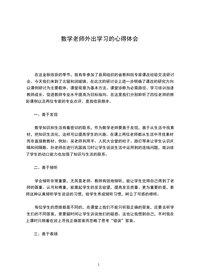 在这金秋收获的季节,我有幸参加了县局组织的省教科院专家课改经验交流研讨会。今天我们来到了北留和润城镇。在此次的研讨会上进一步明确了课改的研究方向:以课例研讨为主要载体、课堂观察为基本方法、课堂诊断为必需路径、学习培训加速教师成长、促进教师专业水平提高为目标指向。在这里我们分别聆听了四位老师的精彩课例以及两位专家的专业点评,是我收获颇丰。