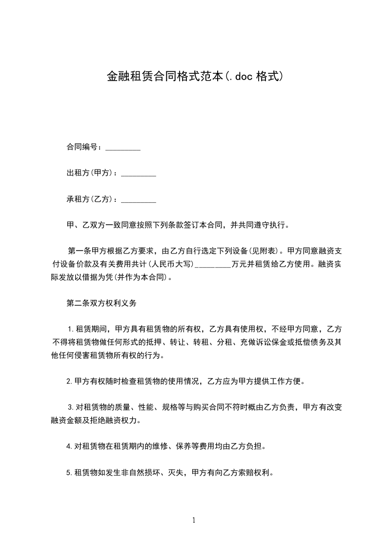 第一条甲方根据乙方要求,由乙方自行选定下列设备(见附表)。甲方同意融资支付设备价款及有关费用共计(人民币大写)_________万元并租赁给乙方使用。融资实际发放以借据为凭(并作为本合同)。