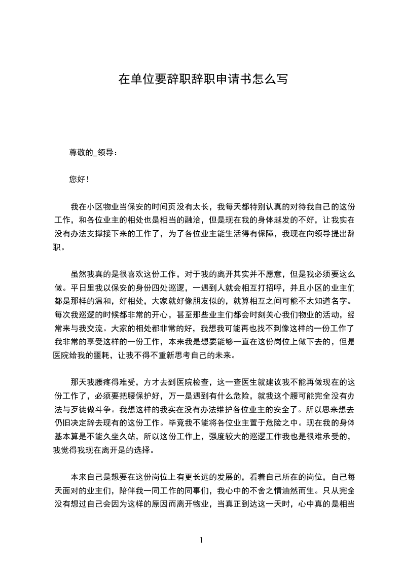 那天我腰疼得难受,方才去到医院检查,这一查医生就建议我不能再做现在的这份工作了,必须要把腰保护好,万一是遇到有什么危险,就我这个腰可能完全没有办法与歹徒做斗争。我想这样的我实在没有办法维护各位业主的安全了。所以思来想去,仍旧决定辞去现有的这份工作。毕竟我不能将各位业主置于危险之中。现在我的身体基本算是不能久坐久站,所以这份工作上,强度较大的巡逻工作我也是很难承受的,我觉得我现在离开是的选择。