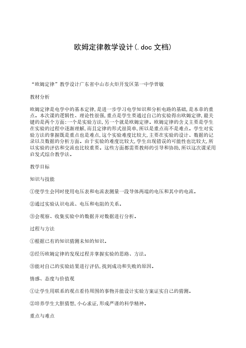 [重点难点关键]重点是欧姆定律所揭示的物理意义及其数学表达式;难点是欧姆定律的实验及其设计;关键是做好本节的实验。