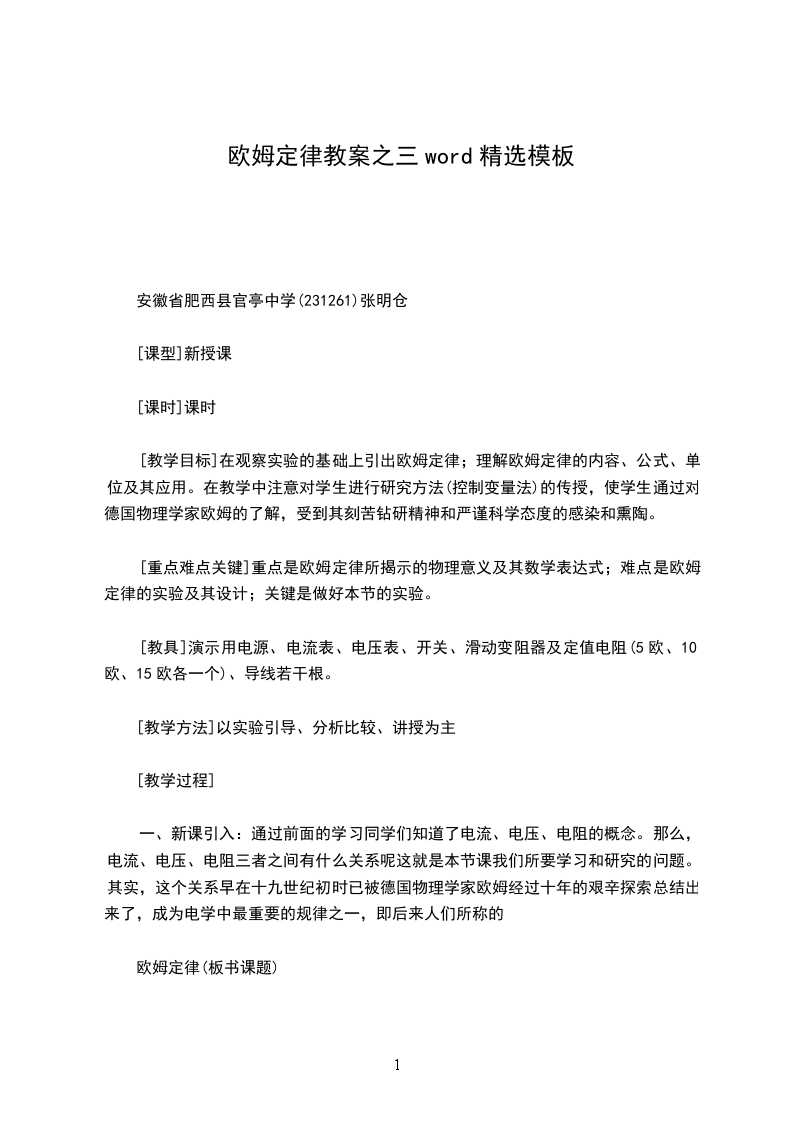 一、新课引入:通过前面的学习同学们知道了电流、电压、电阻的概念。那么,电流、电压、电阻三者之间有什么关系呢这就是本节课我们所要学习和研究的问题。其实,这个关系早在十九世纪初时已被德国物理学家欧姆经过十年的艰辛探索总结出来了,成为电学中最重要的规律之一,即后来人们所称的