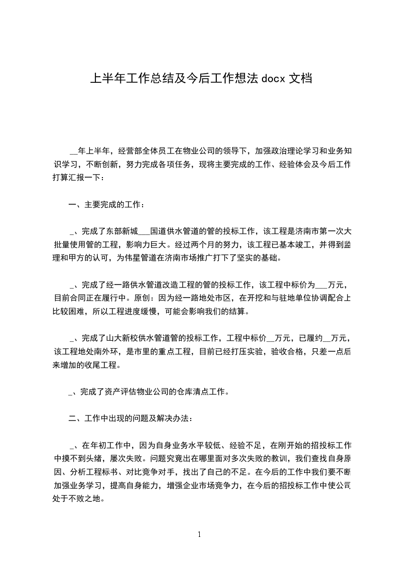 __年上半年,经营部全体员工在物业公司的领导下,加强政治理论学习和业务知识学习,不断创新,努力完成各项任务,现将主要完成的工作、经验体会及今后工作打算汇报一下: