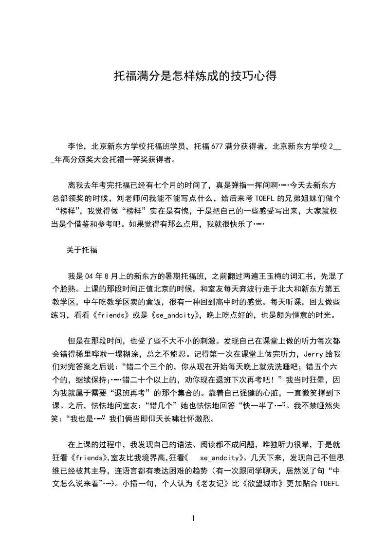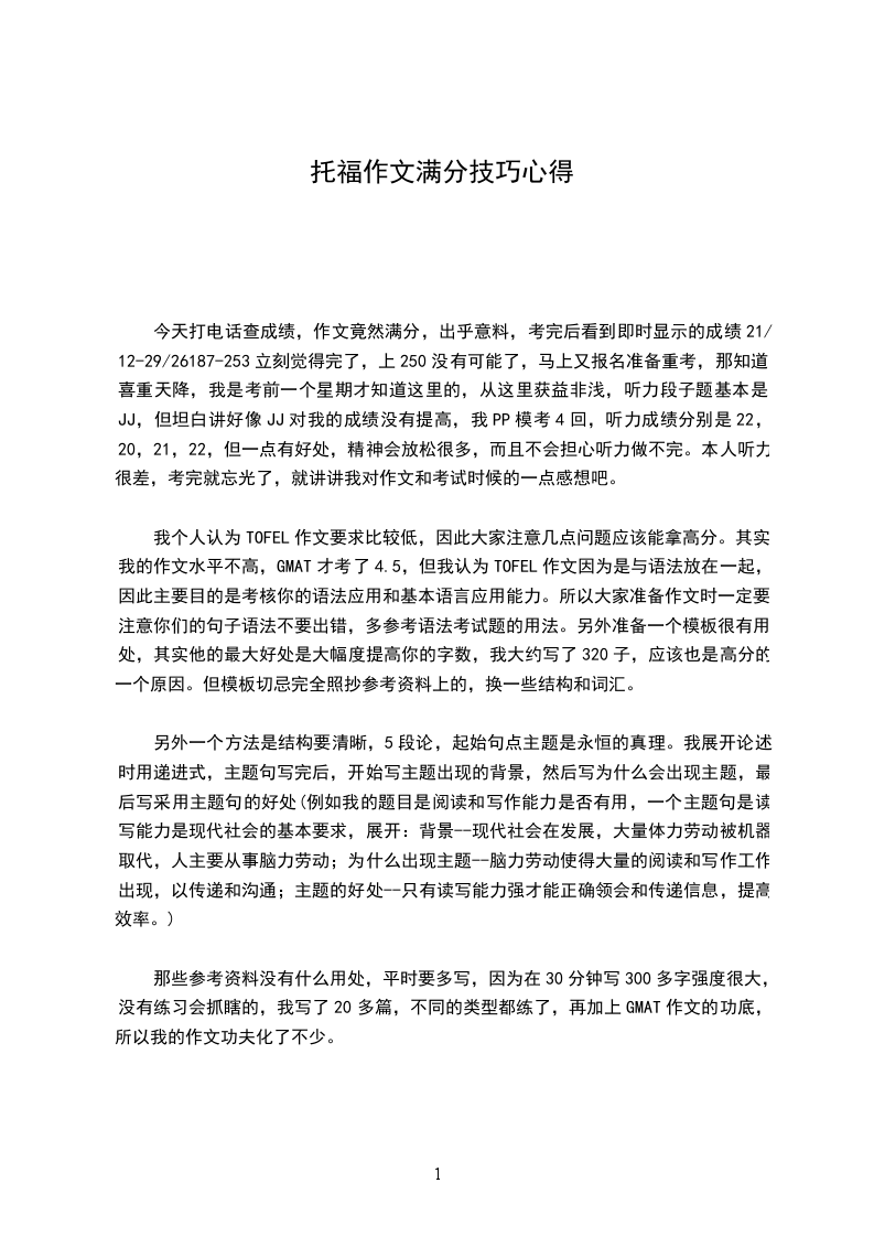 今天打电话查成绩,作文竟然满分,出乎意料,考完后看到即时显示的成绩21/12-29/26187-253立刻觉得完了,上250没有可能了,马上又报名准备重考,那知道喜重天降,我是考前一个星期才知道这里的,从这里获益非浅,听力段子题基本是JJ,但坦白讲好像JJ对我的成绩没有提高,我PP模考4回,听力成绩分别是22,20,21,22,但一点有好处,精神会放松很多,而且不会担心听力做不完。本人听力很差,考完就忘光了,就讲讲我对作文和考试时候的一点感想吧。
