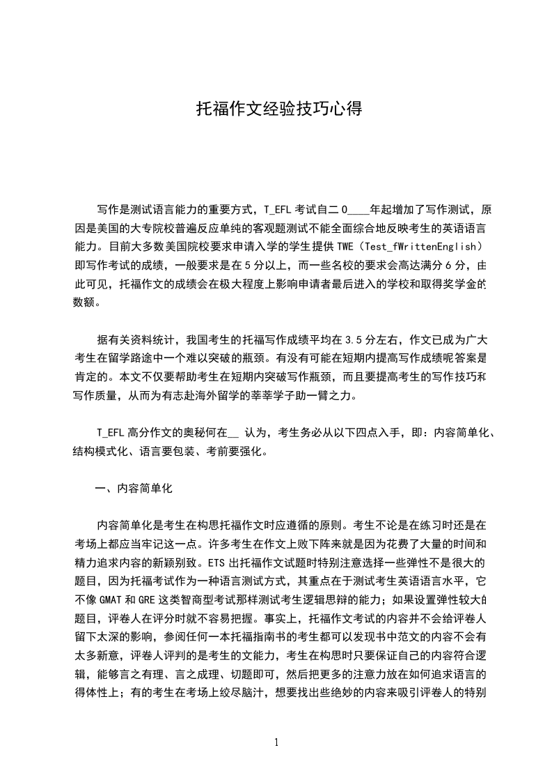 我个人认为TOFEL作文要求比较低,因此大家注意几点问题应该能拿高分。其实我的作文水平不高,GMAT才考了4.5,但我认为TOFEL作文因为是与语法放在一起,因此主要目的是考核你的语法应用和基本语言应用能力。所以大家准备作文时一定要注意你们的句子语法不要出错,多参考语法考试题的用法。另外准备一个模板很有用处,其实他的最大好处是大幅度提高你的字数,我大约写了320子,应该也是高分的一个原因。但模板切忌完全照抄参考资料上的,换一些结构和词汇。
