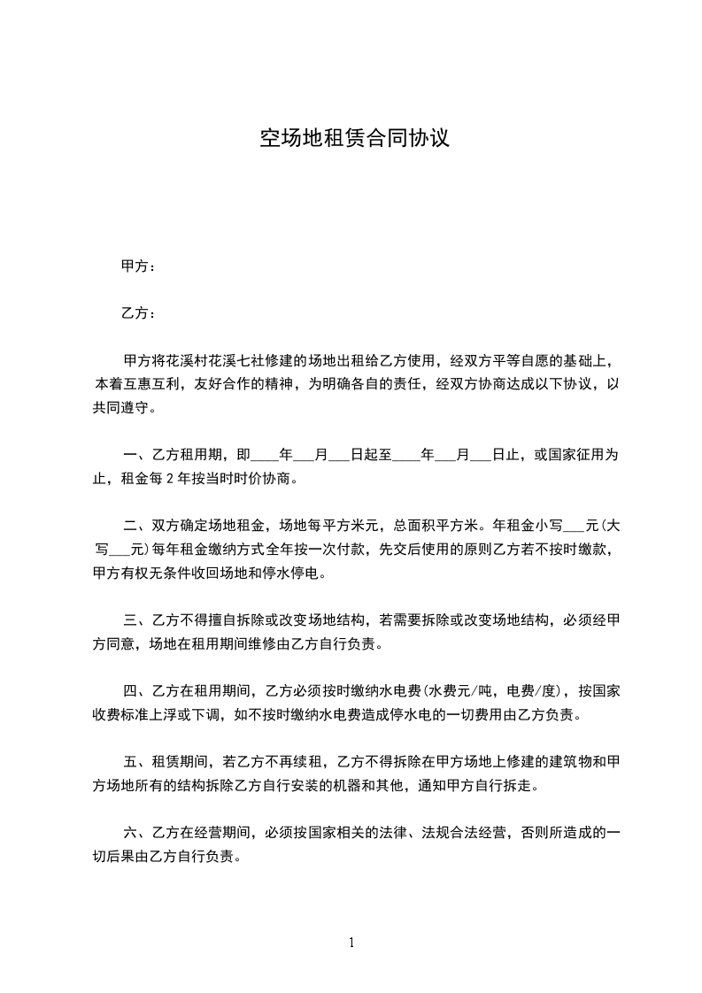 二、双方确定场地租金,场地每平方米元,总面积平方米。年租金小写___元(大写___元)每年租金缴纳方式全年按一次付款,先交后使用的原则乙方若不按时缴款,甲方有权无条件收回场地和停水停电。