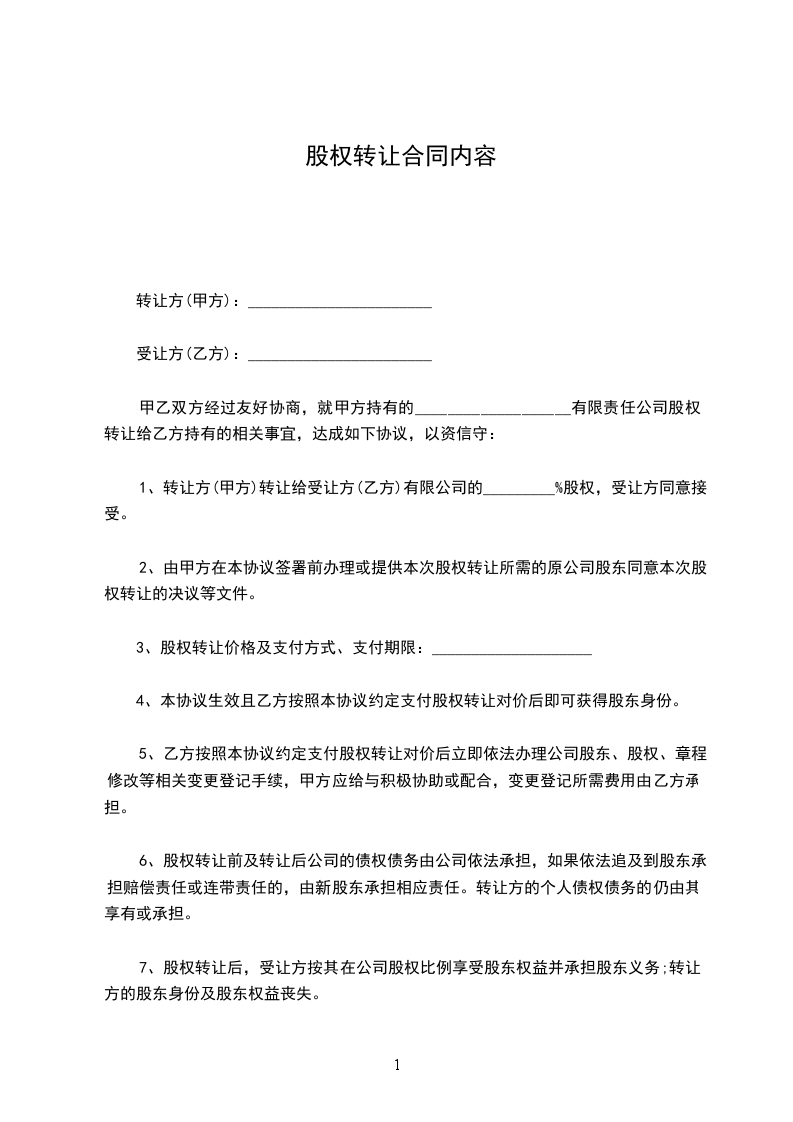 1、转让方(甲方)转让给受让方(乙方)有限公司的_________%股权,受让方同意接受。