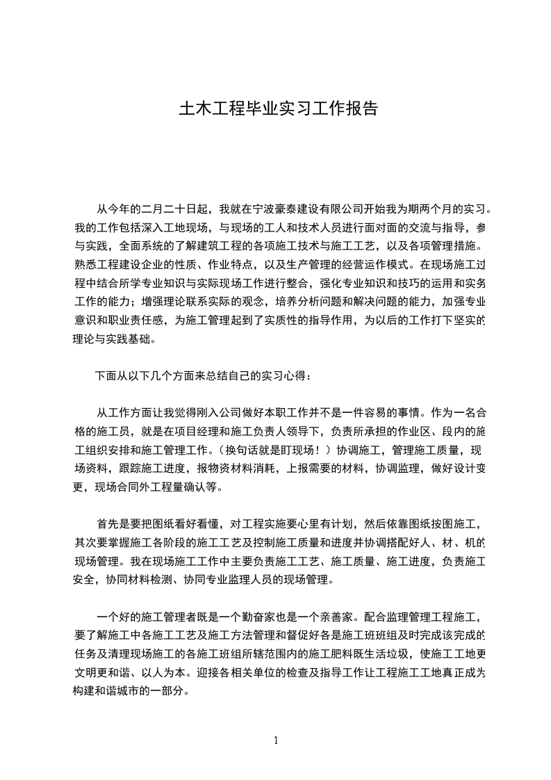 我从__年_月到__年_月在__建承建的项目实习,在实习期间,一方面增强了自己的读图识图能力,了解了将图纸转化到实体建筑的过程;另一方面也了解了在这一过程中所涉及的人事机构和注意事项,以及其他非专业知识的收获。