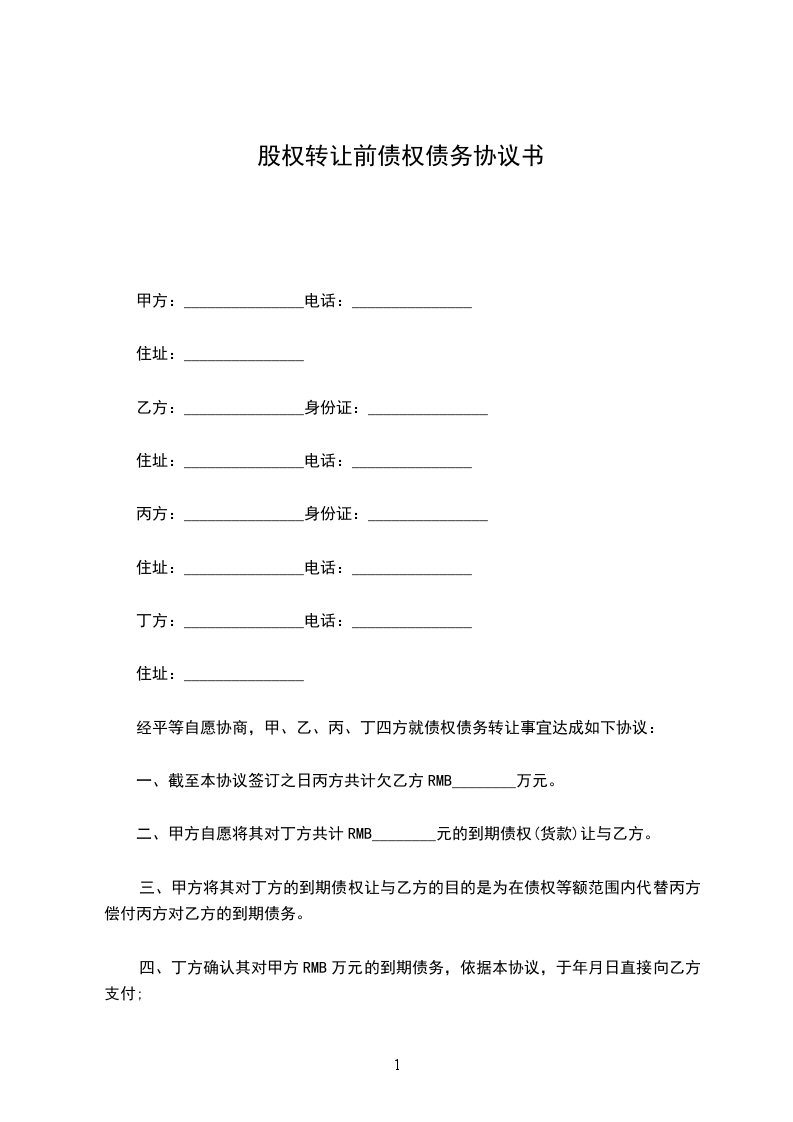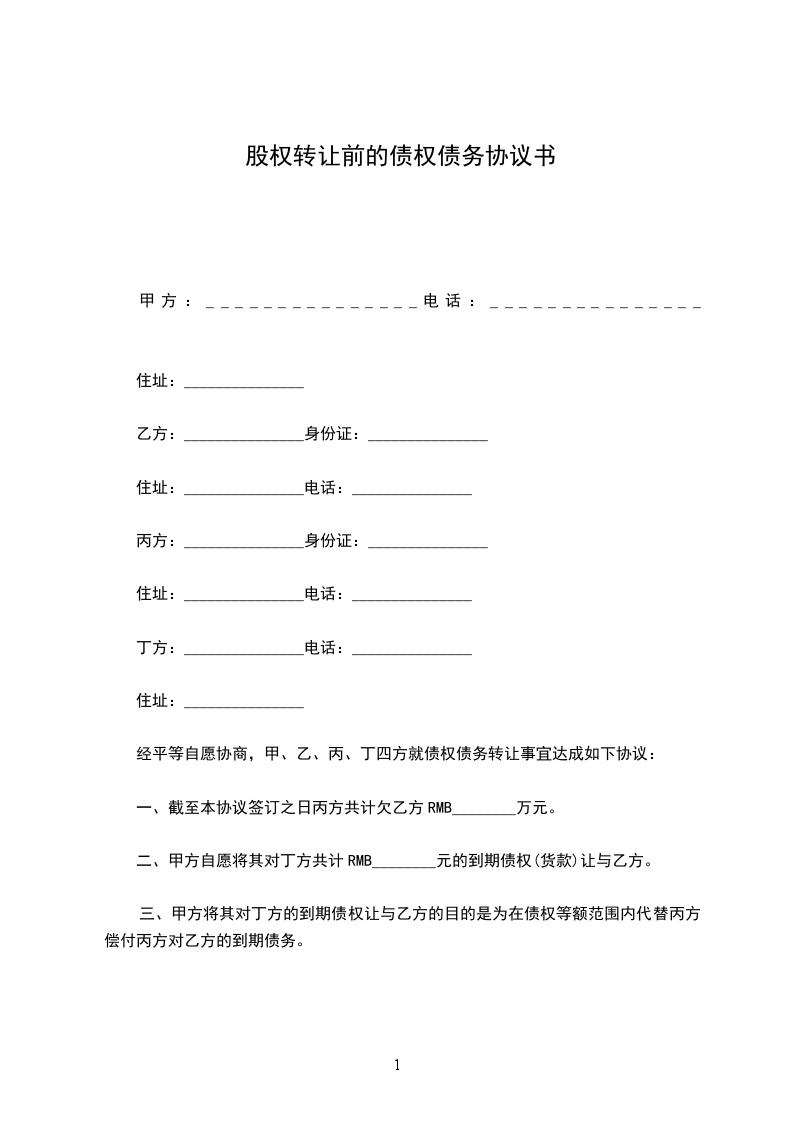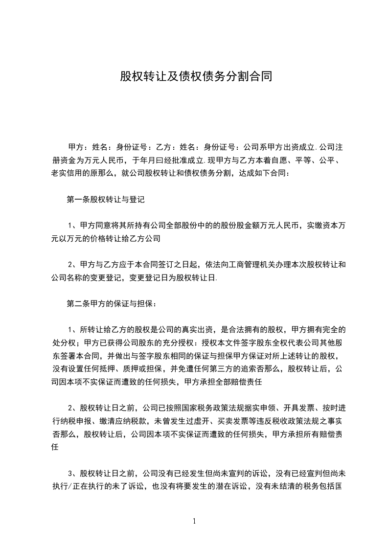 1、转让方(甲方)转让给受让方(乙方)________有限公司的________%股权,受让方同意接受。