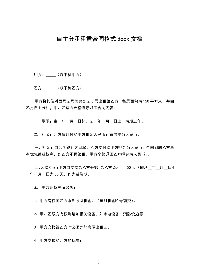 甲方将其位对面号至号楼房2至5层出租给乙方,每层面积为150平方米,并由乙方自主分租,甲、乙双方严格遵守以下合同内容: