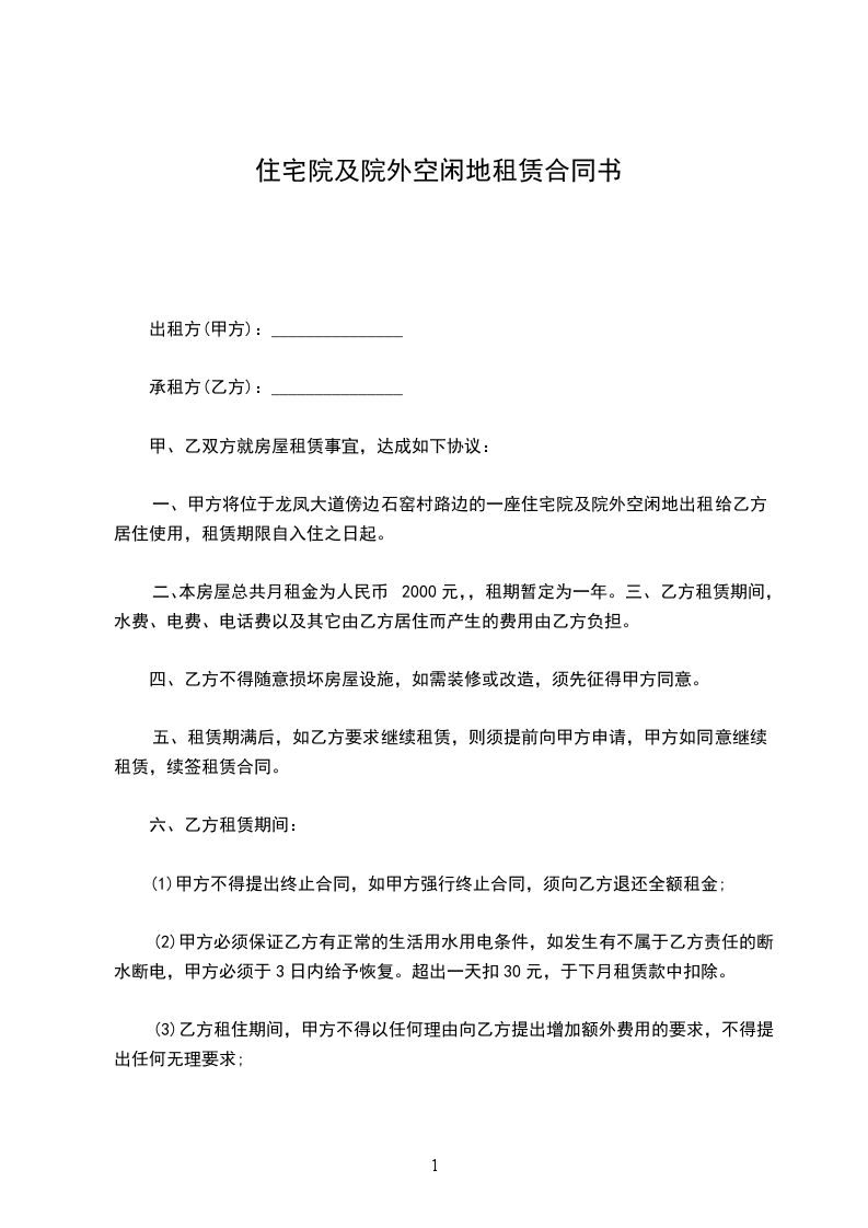 一、甲方将位于龙凤大道傍边石窑村路边的一座住宅院及院外空闲地出租给乙方居住使用,租赁期限自入住之日起。