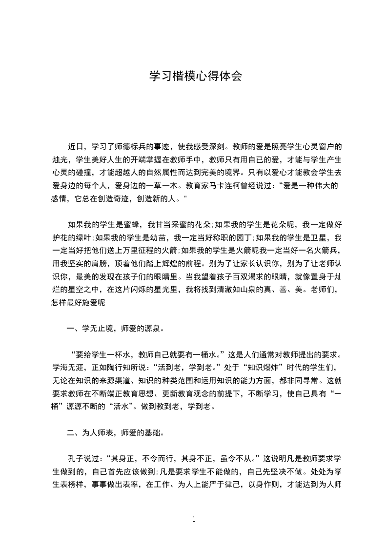 近日,学习了师德标兵的事迹,使我感受深刻。教师的爱是照亮学生心灵窗户的烛光,学生美好人生的开端掌握在教师手中,教师只有用自已的爱,才能与学生产生心灵的碰撞,才能超越人的自然属性而达到完美的境界。只有以爱心才能教会学生去爱身边的每个人,爱身边的一草一木。教育家马卡连柯曾经说过:“爱是一种伟大的感情,它总在创造奇迹,创造新的人。"