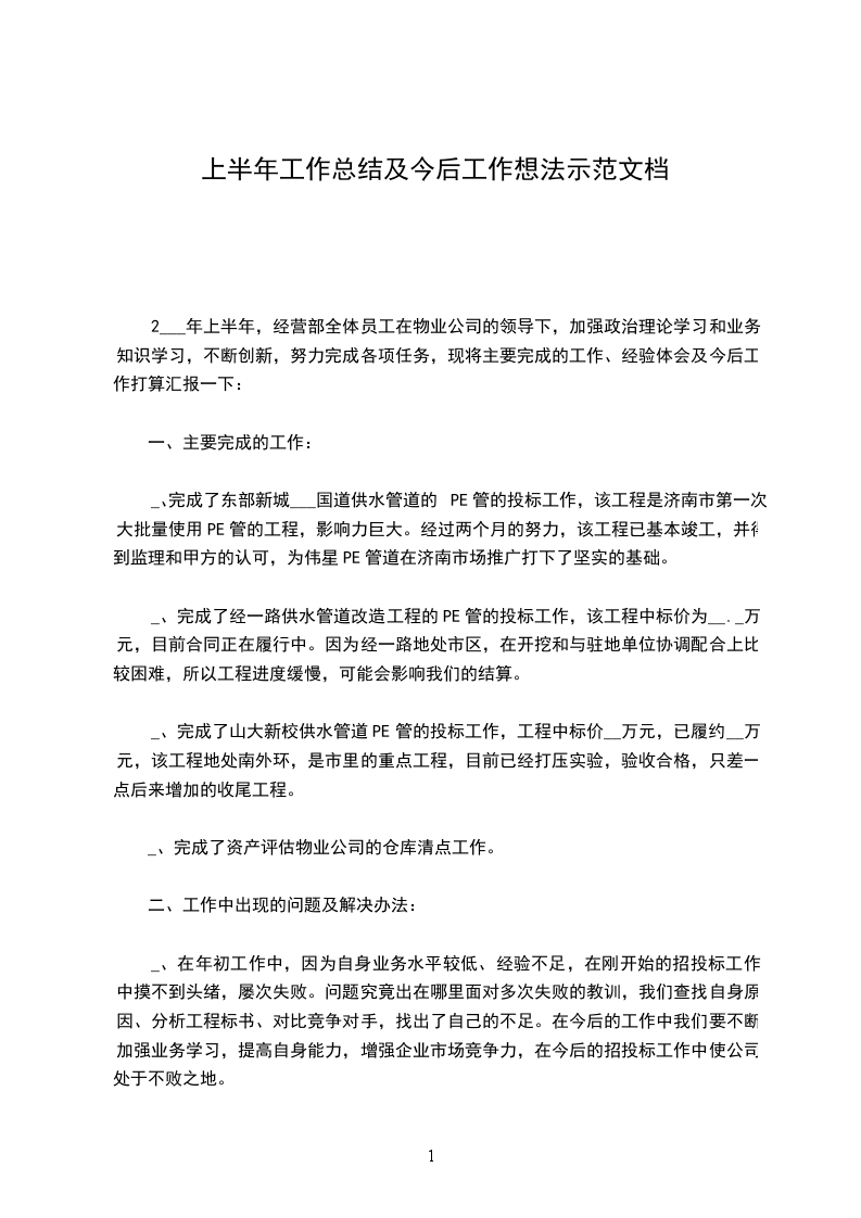 2___年上半年,经营部全体员工在物业公司的领导下,加强政治理论学习和业务知识学习,不断创新,努力完成各项任务,现将主要完成的工作、经验体会及今后工作打算汇报一下: