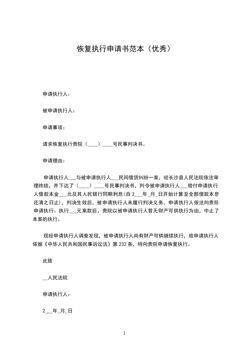 现经申请执行人调查发现,被申请执行人尚有财产可供继续执行,故申请执行人依据《中华人民共和国民事诉讼法》第232条,特向贵院申请恢复执行。