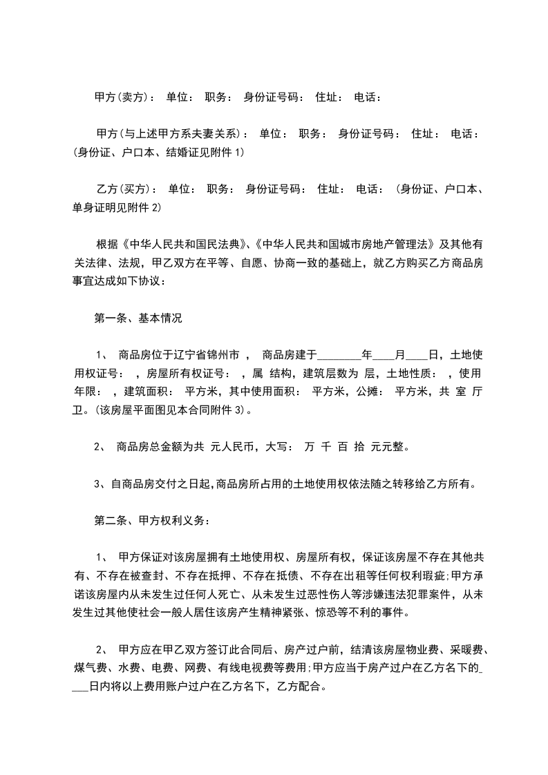 乙方(买方): 单位: 职务: 身份证号码: 住址: 电话: (身份证、户口本、单身证明见附件2)
