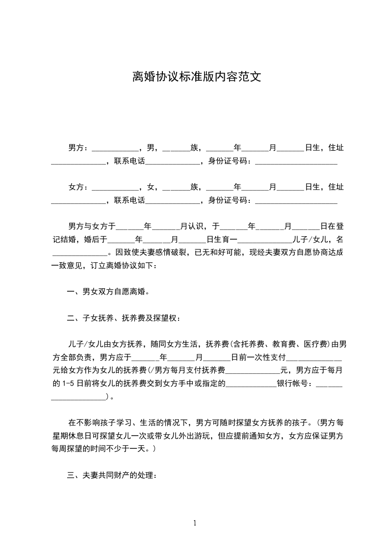 男方与女方于_______年_______月认识,于_______年_______月_______日在登记结婚,婚后于_______年_______月_______日生育一______________儿子/女儿,名______________。因致使夫妻感情破裂,已无和好可能,现经夫妻双方自愿协商达成一致意见,订立离婚协议如下: