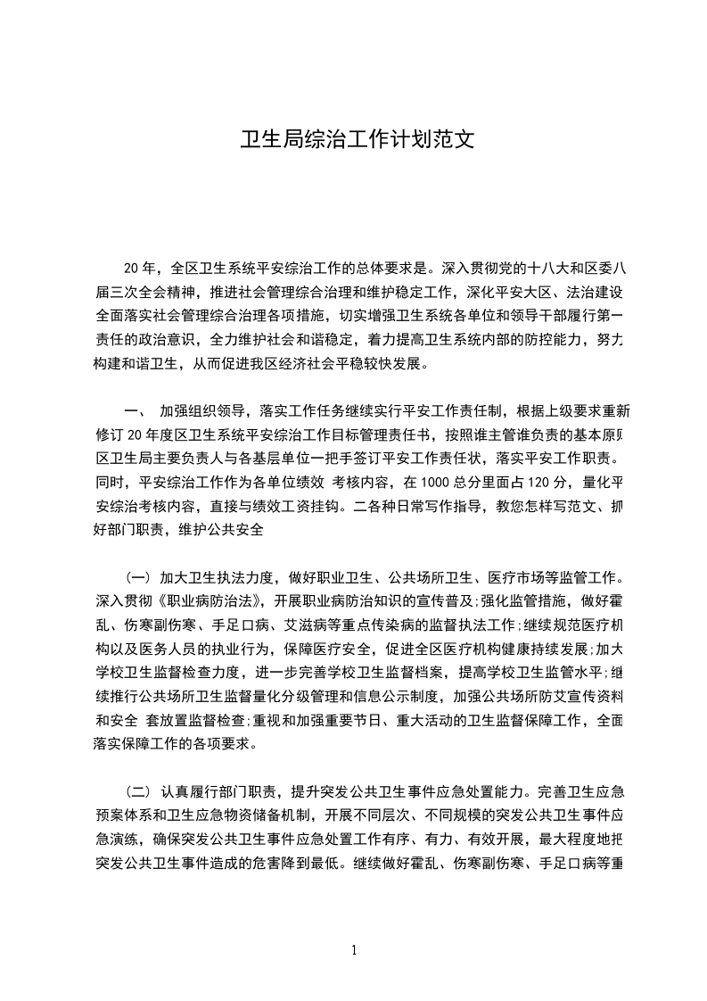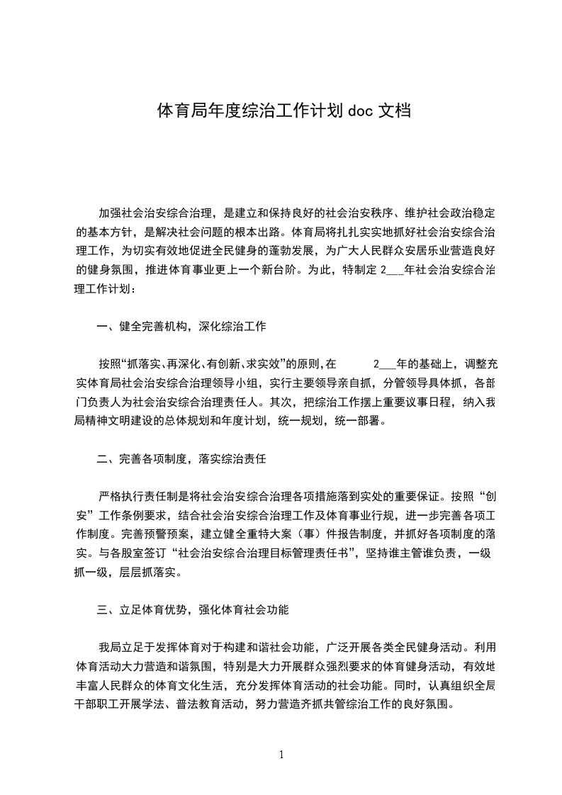 加强社会治安综合治理,是建立和保持良好的社会治安秩序、维护社会政治稳定的基本方针,是解决社会问题的根本出路。体育局将扎扎实实地抓好社会治安综合治理工作,为切实有效地促进全民健身的蓬勃发展,为广大人民群众安居乐业营造良好的健身氛围,推进体育事业更上一个新台阶。为此,特制定2___年社会治安综合治理工作计划: