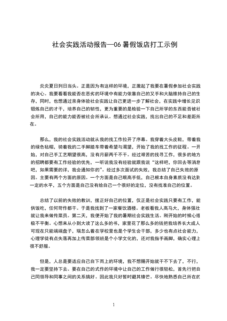 总结了以前的失败的教训,摆正好自己的位置,仅正是社会实践只要有工作,能供饭吃,任何苛作都干。于是我找到了一家餐饮酒楼。老板看我人高马大,身体强壮,就让我来做传菜员。第二天,我便开始了我的暑期社会实践生活。刚开始的时候心理极不平衡。心想来从小到大读了这么多的书,家里花了那么多的钱把我培养长大成人,可现在只能端端盘子,瑞怎么着在学校里也是个学生会干部,多少也有点社会能力,心理学徒有点失落再加上传菜部领班是个小学文化的,还对我指手画脚,确实心理上很不舒服。