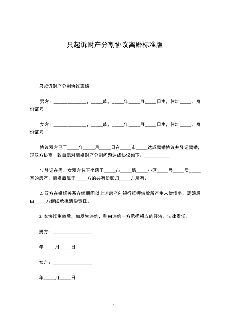 离婚财产分割协议书的标准模板