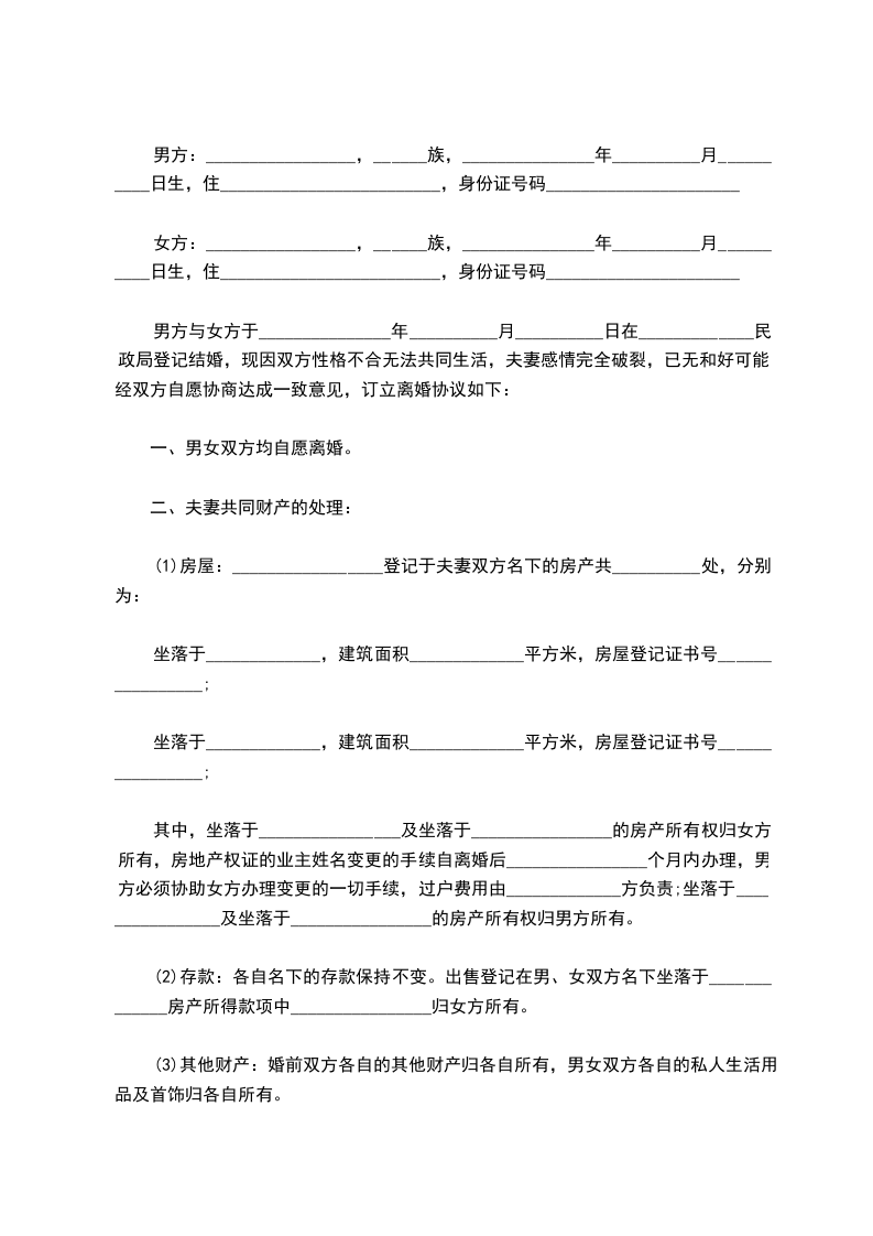 男方与女方于_______________年__________月__________日在_____________民政局登记结婚,现因双方性格不合无法共同生活,夫妻感情完全破裂,已无和好可能,经双方自愿协商达成一致意见,订立离婚协议如下: