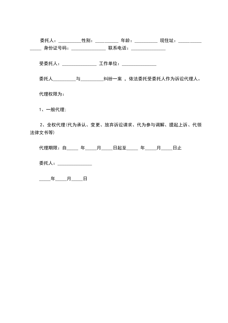 委托人:__________性别:__________ 年龄:__________ 现住址:_______________ 身份证号码:_______________ 联系电话:_______________